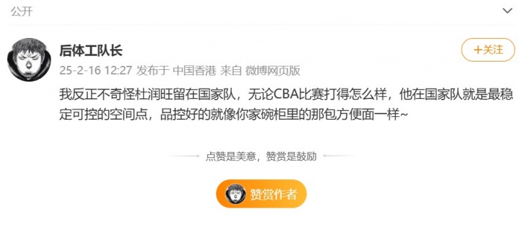媒體人@后體工隊(duì)長(zhǎng)發(fā)微博對(duì)此發(fā)表看法,他寫道:“我反正不奇怪杜潤(rùn)旺留在國家隊(duì),無論CBA比賽打得怎么樣,他在國家隊(duì)就是最穩(wěn)定可控的空間點(diǎn),品控好的就像你家碗柜里的那包方便面一樣~??”