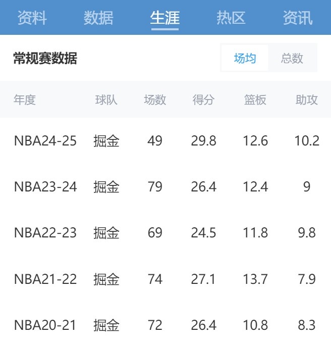 能維持住嗎?約基奇半程29.8+12.6+10.2 前年離場(chǎng)均3雙僅差0.2助