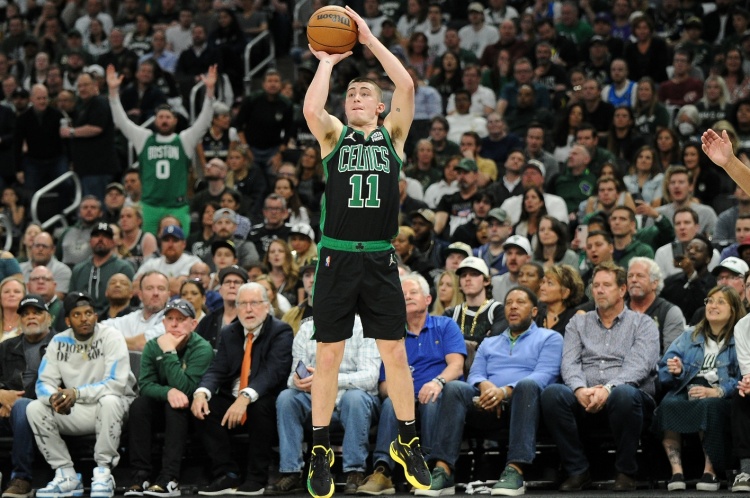 G5半場結(jié)束前4秒,普理查德替補登場。凱爾特人全隊接到指示,要盡力將球交到他手中。在東契奇罰球不中后,霍福德?lián)屜禄@板,迅速尋找普理查德。雖然看到東契奇上前干擾,但霍福德知道這位全明星來不及封堵。普理查德告訴自己:把球投出去,給它一個機(jī)會。起初,他完全沒有意識到周圍正在醞釀的瘋狂。