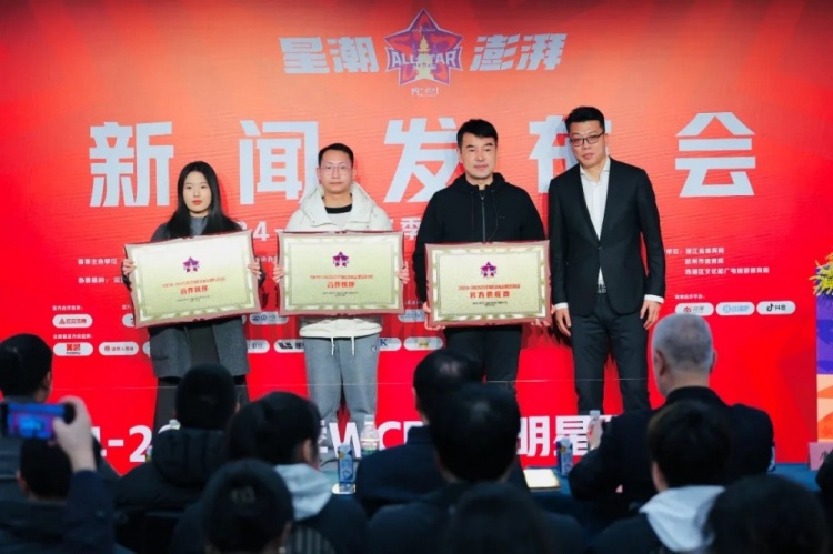 發(fā)布會最后,深籃體育(北京)有限公司W(wǎng)CBA項目負責人楊潤章和浙江蕞紅體育文化策劃有限公司董事長楊笑一起,為全明星周末贊助商代表舉行了授牌儀式。