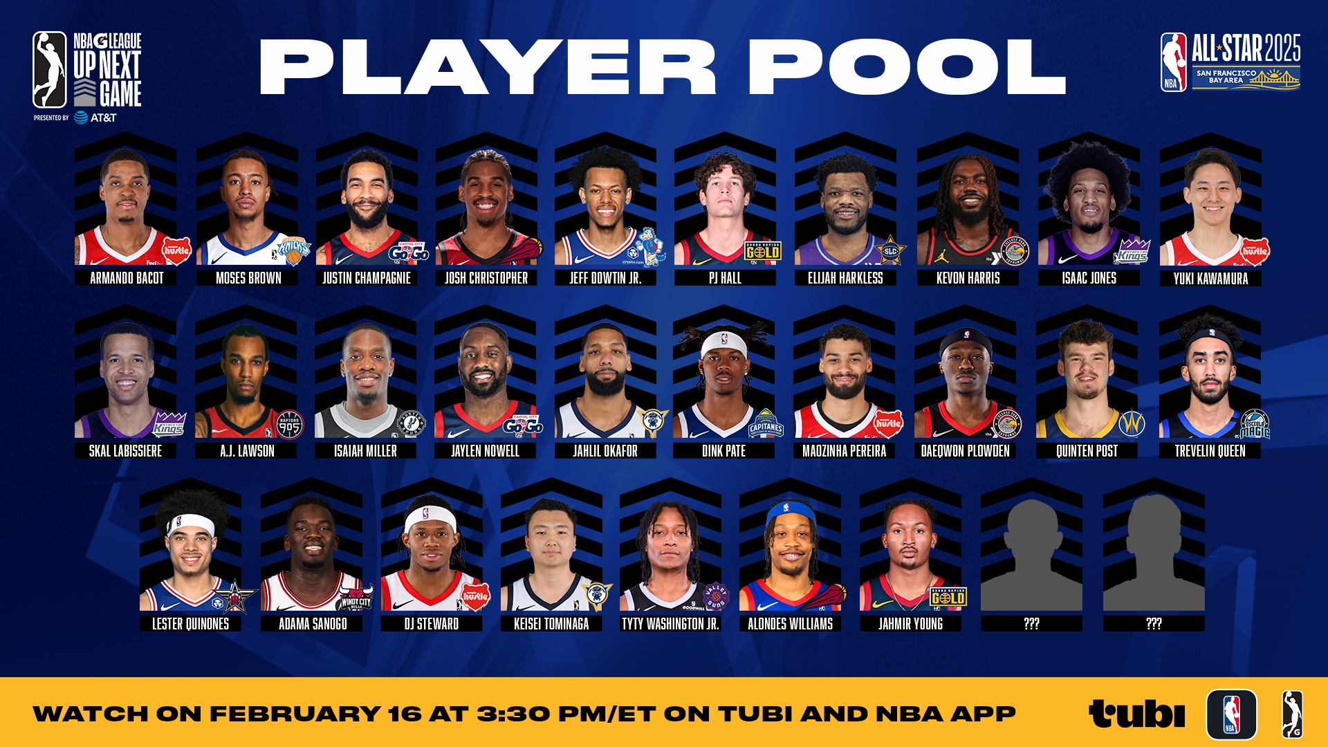 NBA全明星周末Up Next Games是今年全明星周末的一部分,與全明星正賽類似,也將由4支球隊共28名球員以錦標(biāo)賽的形式展開爭奪。28名球員(拆成4個隊)其中的10名將由球迷投出,另外18名將由G聯(lián)賽官方選擇,其中將至少包括一名圣克魯茲勇士的球員(金州勇士下屬球隊,此舉是因為今年全明星在勇士所在的舊金山舉辦)。