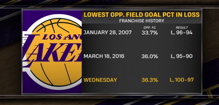 轉(zhuǎn)播方曬出數(shù)據(jù),這是湖人隊(duì)史輸球時(shí)對手投籃命中率第三低的紀(jì)錄。