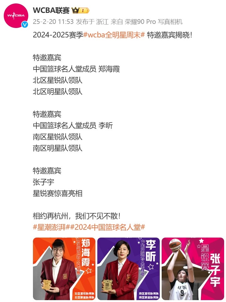 2月20日訊 本周末,本賽季的WCBA全明星賽將會在杭州黃龍體育中心舉行。WCBA聯(lián)賽官方微博發(fā)文公布了三位特邀嘉賓,分別是鄭海霞、李昕和張子宇,原文如下: 本文標(biāo)簽: CBA 中國籃球 籃球 WCBA