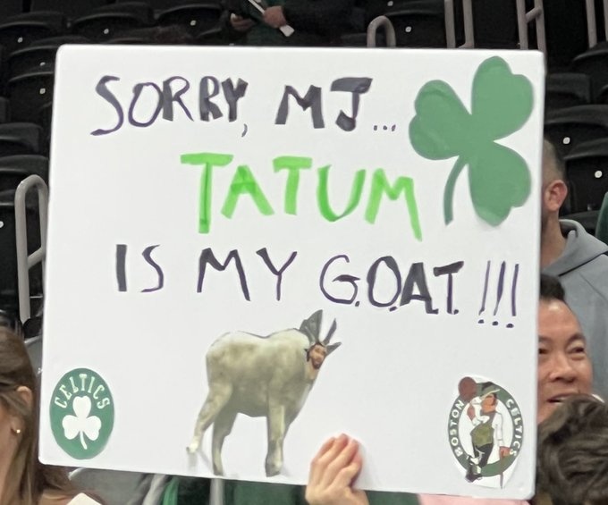 賽前,綠軍主場(chǎng)球迷舉牌,上面貼著塔圖姆頭像的山羊和綠軍隊(duì)徽,配文寫道:“對(duì)不起了MJ(喬丹),塔圖姆才是我心目中的GOAT(山羊,歷史最佳之意)。”