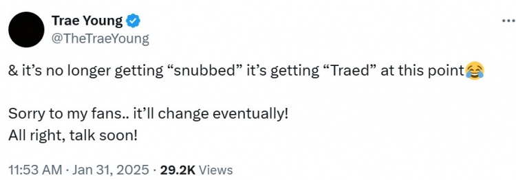 特雷-楊無緣本賽季的全明星,對此,他更推道:“這不是被‘冷落’了,而是被‘特雷-楊’啦。對不住我的球迷們。這遲早會(huì)改變的!就這樣,回頭再聊?!?/p>
