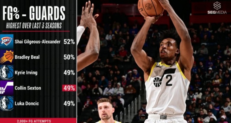 轉(zhuǎn)播方給到一組數(shù)據(jù),在最近的三個(gè)賽季中,投籃命中率(出手至少2000+)Top5的后衛(wèi)如下: