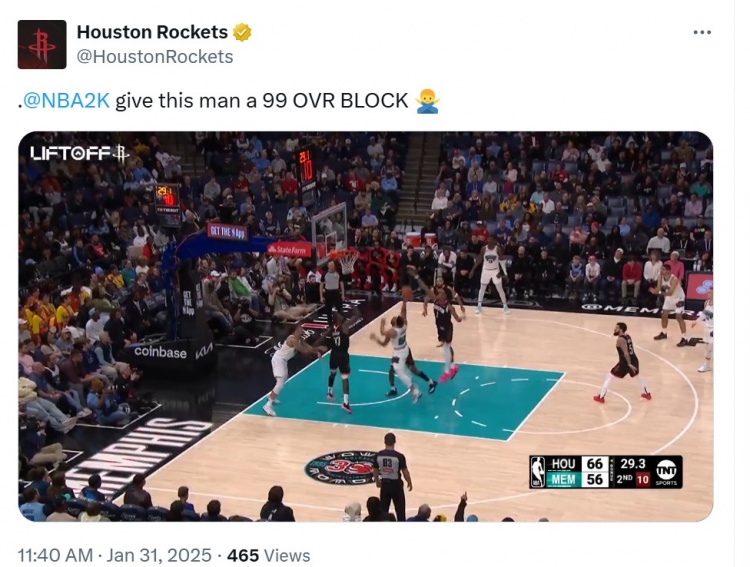 火箭官推轉(zhuǎn)發(fā)了這個蓋帽,并@NBA 2K官方道:“給這個小伙子99分的蓋帽值吧?!?/p>