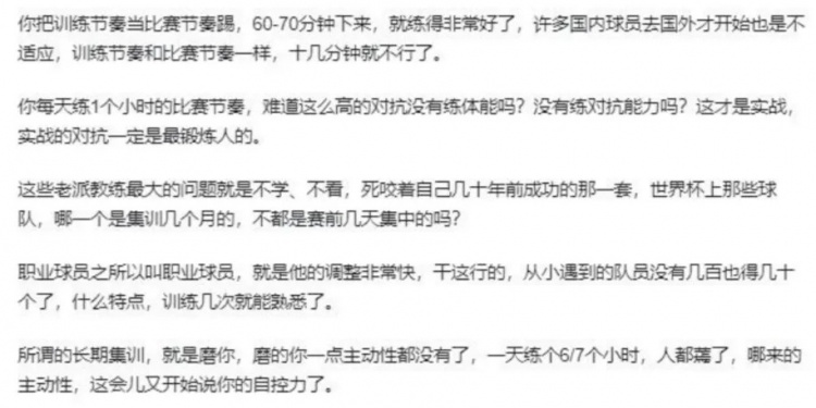 所以,問(wèn)題不在集訓(xùn)本身,而在于現(xiàn)在大環(huán)境改變下傳統(tǒng)意義上長(zhǎng)期集訓(xùn)表現(xiàn)出的不適應(yīng)性。集訓(xùn)本身在這一過(guò)程中有什么錯(cuò)呢?而且宮魯鳴的話(huà)“只有長(zhǎng)期集訓(xùn)才能提升默契貫徹戰(zhàn)術(shù)?!边@一“只有...才...”的句式起碼是基于過(guò)去的實(shí)踐經(jīng)驗(yàn)得出的結(jié)論;而在這一問(wèn)題下的討論里,我們能看到大量“只要…就…”般的許愿。