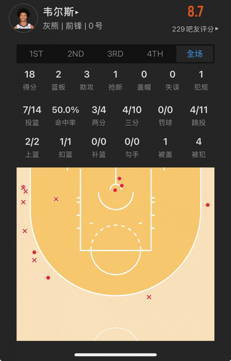 灰熊39號(hào)秀 杰倫-韋爾斯 登場(chǎng)38.6分鐘