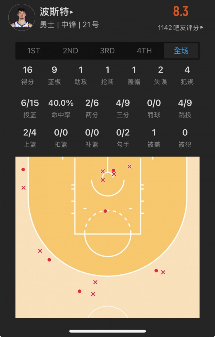 勇士52號(hào)秀 昆滕-波斯特 登場(chǎng)25.0分鐘