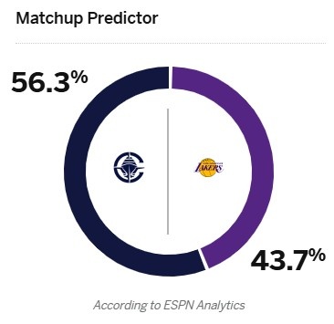 ESPN給出了本場比賽勝率預(yù)測,其中5連勝的湖人為43.7%,快船為56.3%。