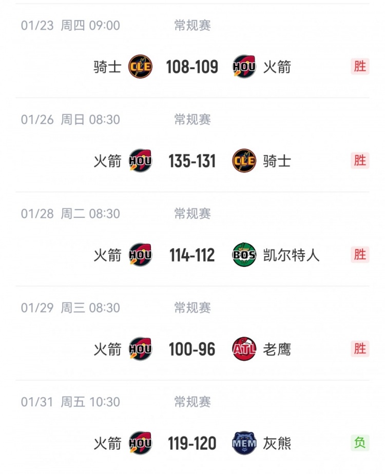 在過去5場比賽中,火箭每場比賽分差都不超過4分,期間火箭4勝1負(fù)。