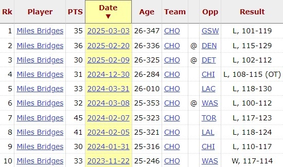 3月8日訊 NBA常規(guī)賽,黃蜂117-118惜敗騎士。此役,邁爾斯-布里奇斯打了39分鐘32投15中,三分10中4、罰球13中12空砍全場最高46分外加8籃板2助攻2搶斷,46分生涯新高!值得一提的是,邁爾斯-布里奇斯在過去10場拿到30+的比賽全輸了。 本文標(biāo)簽: NBA 籃球 黃蜂