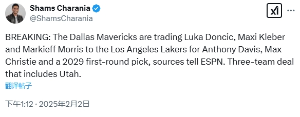 02月02日訊 據(jù)名記Shams報道,消息人士透露,獨行俠將把東契奇、克萊伯和莫里斯交易給湖人,換來濃眉、克里斯蒂和2029年首輪。Shams隨后還再次確認了這條消息,并補充了交易細節(jié)。值得一提的是,這是真的Shams的賬號。 本文標(biāo)簽: 籃球 NBA 湖人 獨行俠 東契奇 戴維斯 小牛