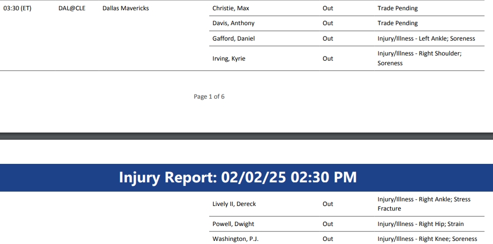 此役,歐文(右肩酸痛)、加福德(左踝酸痛)、PJ-華盛頓(右膝酸痛)、萊夫利(右腳踝應力骨折)、德懷特-鮑威爾(右臀部拉傷)五人因傷缺陣。