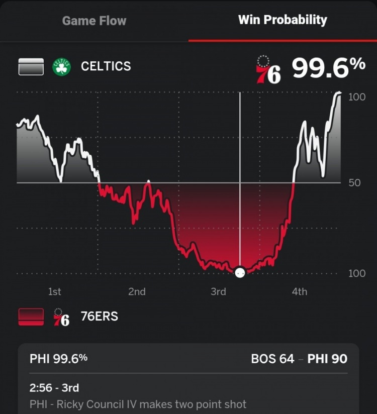 2月3日訊 NBA常規(guī)賽,凱爾特人118-110逆轉(zhuǎn)戰(zhàn)勝76人。比賽第三節(jié)還剩2分56秒時(shí),76人一度領(lǐng)先26分。ESPN數(shù)據(jù)預(yù)測(cè)顯示,76人當(dāng)時(shí)贏球概率高達(dá)99.6%。 本文標(biāo)簽: 籃球 NBA 76人 凱爾特人
