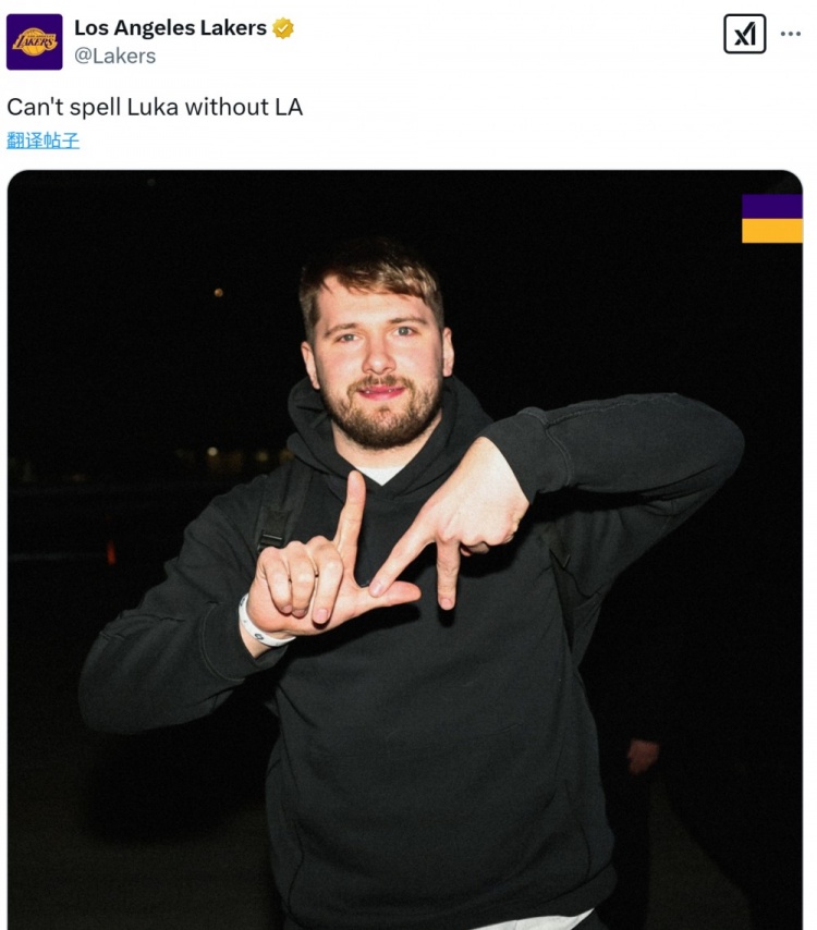 湖人官方曬出了他比“LA(洛杉磯簡(jiǎn)稱)”手勢(shì)的照片,寫道:“少了LA(這兩個(gè)字母)是拼不出Luka(盧卡)的?!?/p>
