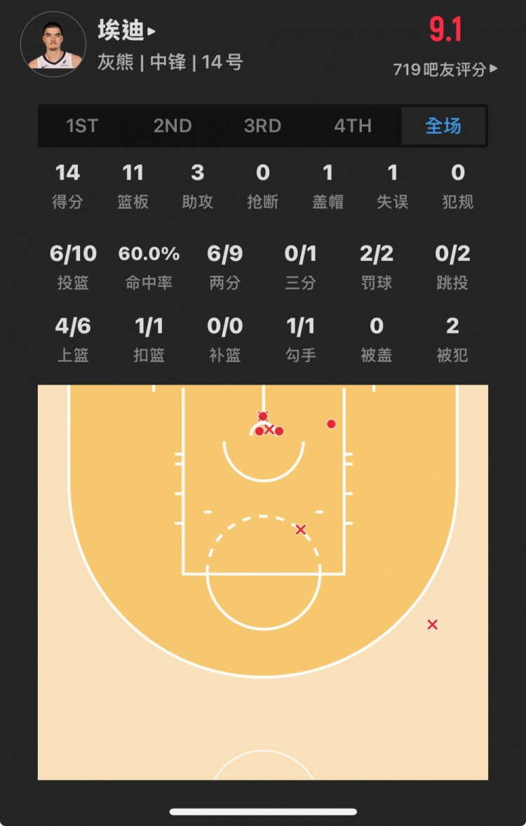 灰熊9號秀 扎克-埃迪 登場18.6分鐘