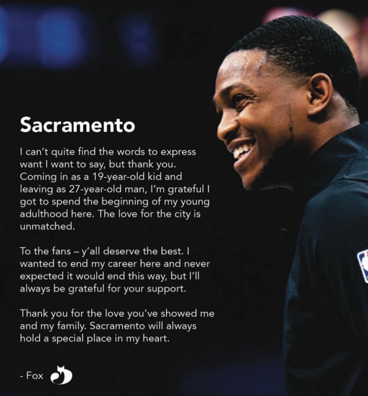 致球迷們,你們理應(yīng)得到最好的。我本想在這里結(jié)束職業(yè)生涯,從未料到會(huì)以這樣的方式離開(kāi),但我會(huì)永遠(yuǎn)感激你們的支持。感謝你們給予我和我家人的愛(ài)。薩克拉門(mén)托在我心中永遠(yuǎn)有一個(gè)特殊的位置。