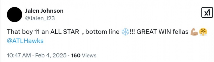2月4日訊 NBA常規(guī)賽,老鷹132-130險勝活塞。本場比賽,老鷹球星特雷-楊表現(xiàn)出色,末節(jié)命中關鍵三分反超并投進絕殺后仰跳投,在35分鐘的時間里,投籃16中9,三分球8中4,罰球14中12,砍下34分9助攻。賽后,老鷹前鋒杰倫-約翰遜更推道:“那個11號男孩是全明星,最差都應該是?。?!非常棒的勝利???????????? ?!?/p> 本文標簽: NBA 籃球 老鷹 特雷-楊