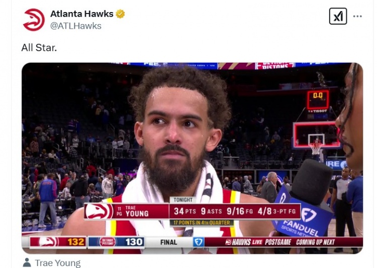 2月4日訊 NBA常規(guī)賽,老鷹132-130險勝活塞。本場比賽,老鷹球星特雷-楊表現(xiàn)出色,末節(jié)命中關(guān)鍵三分反超并投進(jìn)絕殺后仰跳投,在35分鐘的時間里,投籃16中9,三分球8中4,罰球14中12,砍下34分9助攻的數(shù)據(jù),不過有5次失誤5次犯規(guī)。賽后,老鷹官推曬出了特雷-楊的采訪照片,配文:“他是全明星?!?/p> 本文標(biāo)簽: NBA 籃球 東部 老鷹 特雷-楊