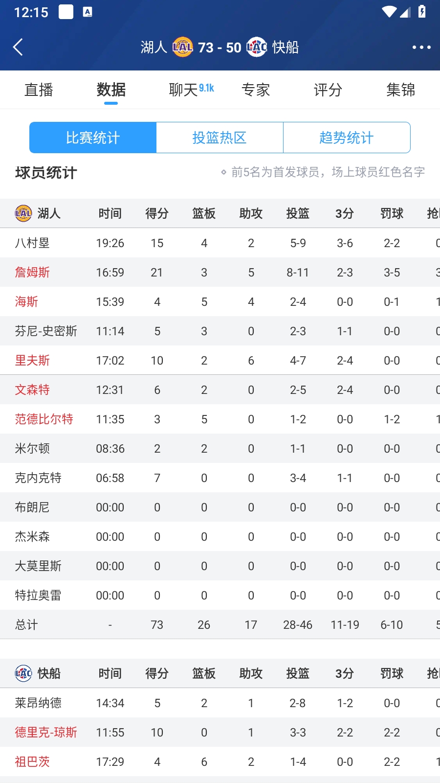 詹姆斯老當益壯21分&湖人全民皆兵 湖人半場轟73分領先快船23分