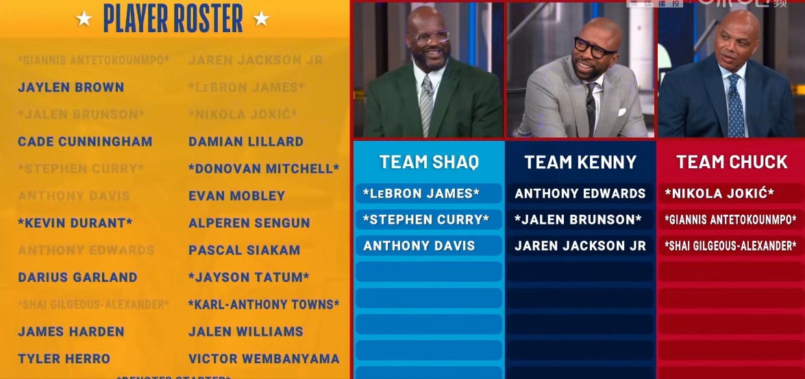 02月07日訊 NBA全明星選人正在進(jìn)行中,TNT三巨頭奧尼爾、肯尼-史密斯和巴克利對24名全明星進(jìn)行選人,奧尼爾首選詹姆斯,肯尼-史密斯首選愛德華茲,巴克利首選約基奇,奧尼爾隨后選擇庫里,達(dá)成詹庫同隊。