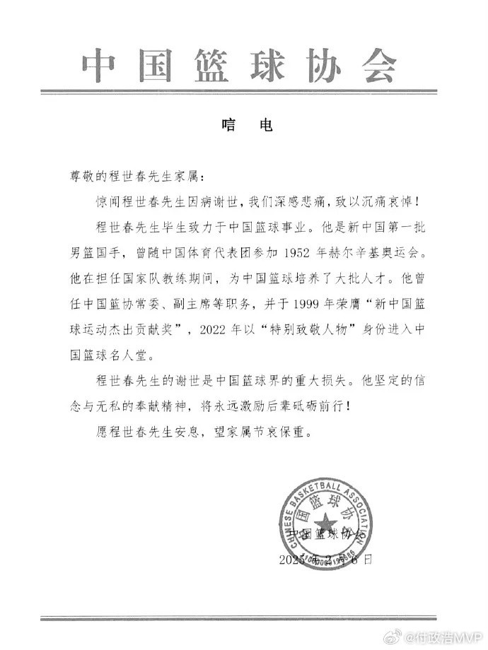 2月7日訊 今日,據(jù)媒體人付政浩透露,新中國第一代國手程世春因病逝世,中國籃協(xié)向程世春協(xié)家屬發(fā)唁電慰問。