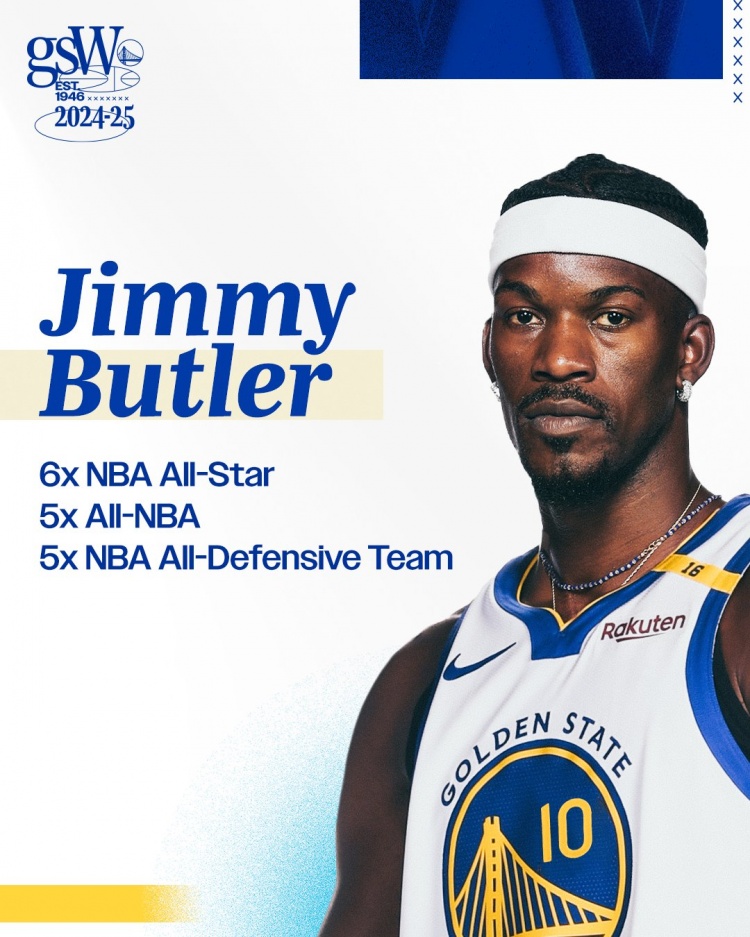 勇士官方也曬出照片歡迎巴特勒,并羅列了巴特勒的個(gè)人榮譽(yù):6屆全明星、5次入選最佳陣容、5次入選最佳防守陣容。