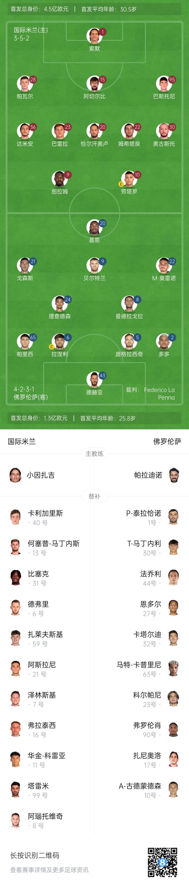 國米首發(fā):1-索默、28-帕瓦爾、15-阿切爾比、95-巴斯托尼、36-達(dá)米安、23-巴雷拉、20-恰爾汗奧盧、22-姆希塔良、30-奧古斯托、9-小圖拉姆、10-勞塔羅