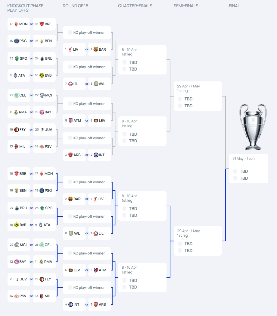球隊(duì)的潛在對手也由其聯(lián)賽階段排名決定。附加賽中,排名第9或第10的球隊(duì),將對陣排名第23或24名的球隊(duì);排名第11名或12名的球隊(duì),將對陣排名第21或22名的球隊(duì),以此類推。16強(qiáng)抽簽中,聯(lián)賽階段排名第1或第2的球隊(duì),其對手將來自附加賽15/16/17/18名球隊(duì)的晉級者;排名第3或第4的球隊(duì),其對手將來自附加賽13/14/19/20的晉級球隊(duì),以此類推。