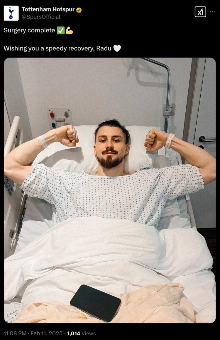 熱刺官方曬出德拉古辛術(shù)后狀態(tài)良好的照片,并祝福他:手術(shù)順利完成,祝你早日康復。