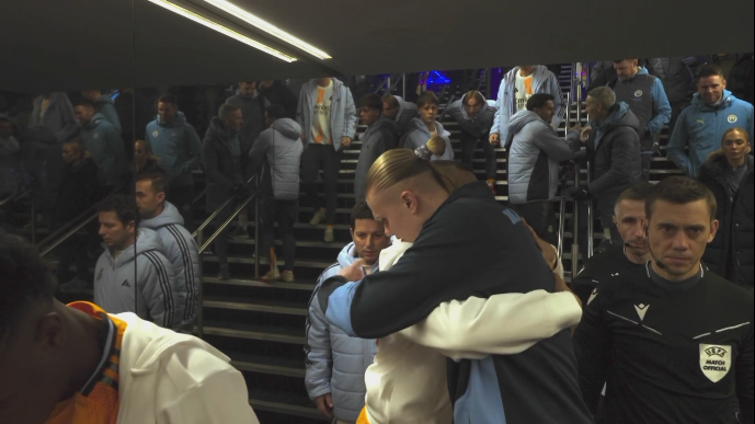 2月12日訊 歐冠淘汰賽附加賽首回合,曼城vs皇馬。賽前,哈蘭德和姆巴佩在球迷通道擁抱。