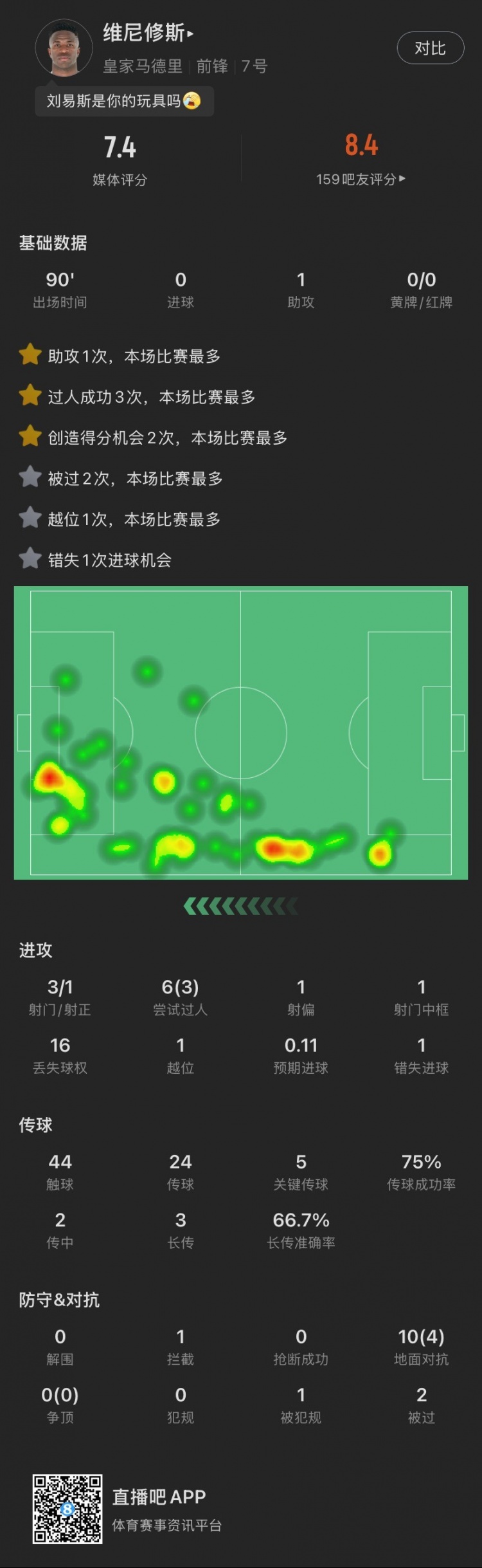 2月12日訊 在剛剛結(jié)束的歐冠淘汰賽附加賽焦點戰(zhàn)中,皇馬3-2絕殺曼城。本場比賽,雖然曼城球迷拉出金球獎橫幅進行嘲諷,但維尼修斯似乎未受影響,貢獻了絕殺球的助攻,獲評7.4分。