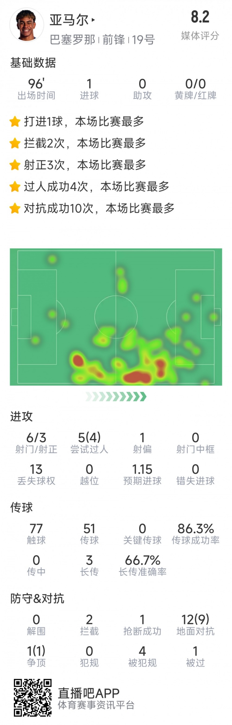 1月30日訊 在本輪歐冠,巴薩2-2戰(zhàn)平亞特蘭大,亞馬爾打進(jìn)一球,以下為他在本場數(shù)據(jù):比賽時間90分鐘1粒進(jìn)球6射3正5次過人4次成功77次觸球傳球成功率86.3%2次攔截1次搶斷13次對抗10次成功sofa評分8.2分 本文標(biāo)簽: 足球 西甲 巴塞羅那