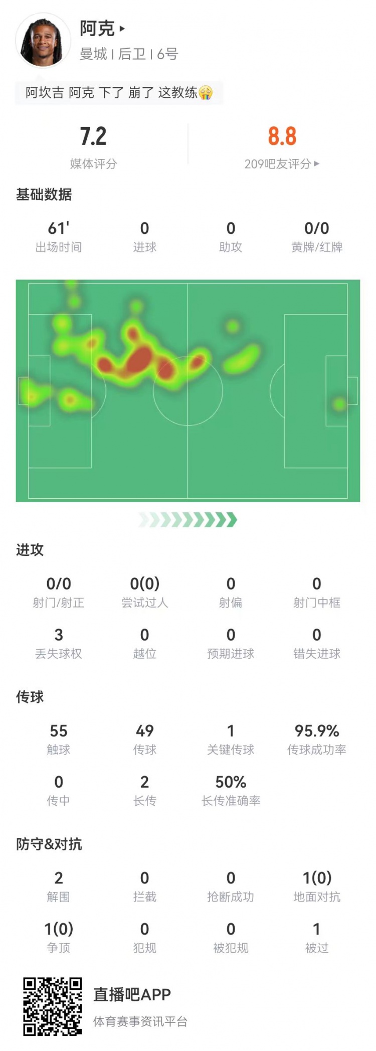 2月12日訊 曼城在本輪歐冠2-3被皇馬逆轉(zhuǎn),阿克本場數(shù)據(jù)如下:首發(fā)出戰(zhàn)61分鐘2解圍2封堵1被過1門線解圍2對抗、0成功3丟失球權(quán)55觸球49傳球、47成功,成功率96%1關(guān)鍵傳球2長傳、1成功獲評7.2分 本文標(biāo)簽: 足球 英超 曼城 西甲 皇家馬德里