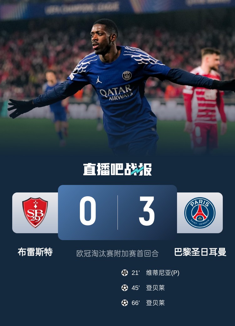 登貝萊梅開二度+造點,巴黎3-0布雷斯特取得先機。