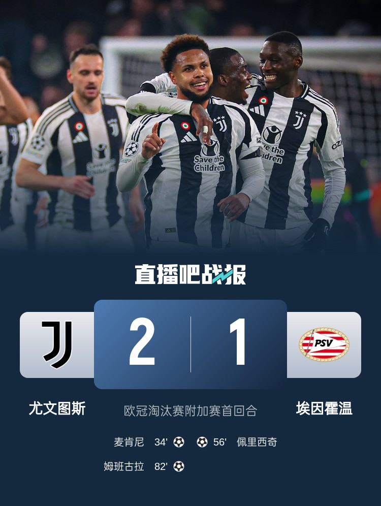姆班古拉替補制勝,尤文2-1埃因霍溫,雙方次回合將于2月20日移師埃因霍溫主場菲利普球場進(jìn)行。
