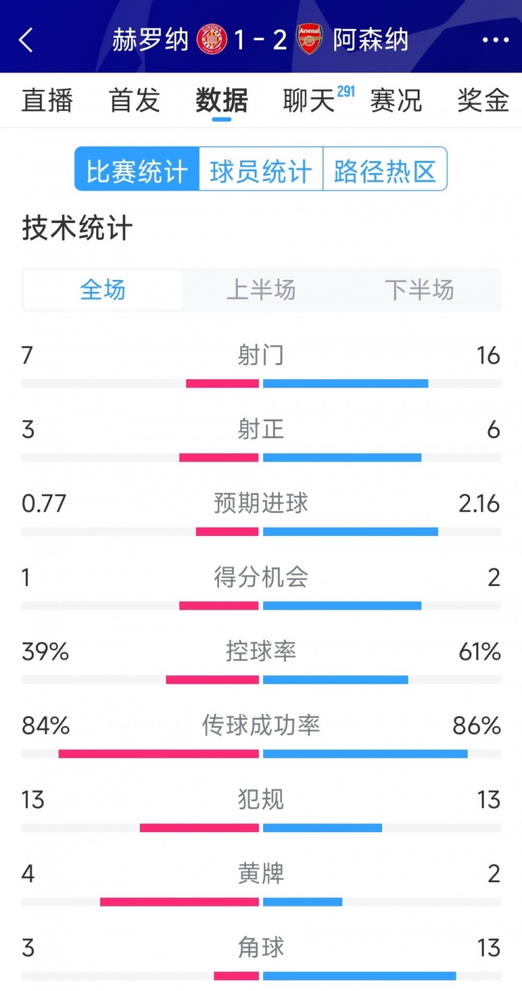 1月30日訊 在本輪歐冠,阿森納2-1擊敗赫羅納,以下為雙方全場(chǎng)數(shù)據(jù)對(duì)比:赫羅納vs阿森納射門:7-16射正:3-6預(yù)期進(jìn)球:0.77-2.16得分機(jī)會(huì):1-2控球率:39%-61%傳球成功率:84%-86%犯規(guī):13-13黃牌:4-2角球:3-13 本文標(biāo)簽: 足球 英超 阿森納