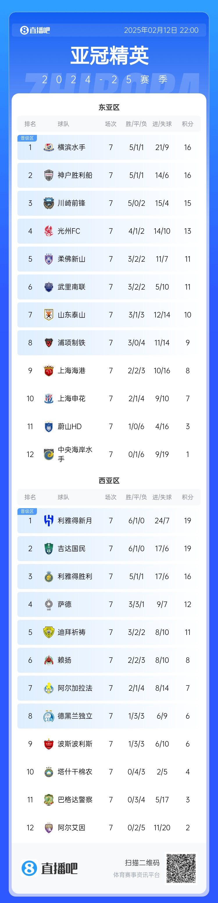 中超3支球隊(duì)在本輪亞冠取得1勝2負(fù)的戰(zhàn)績(jī),目前僅山東泰山排在第7,身處晉級(jí)區(qū),上海海港排名第9上海申花第10。