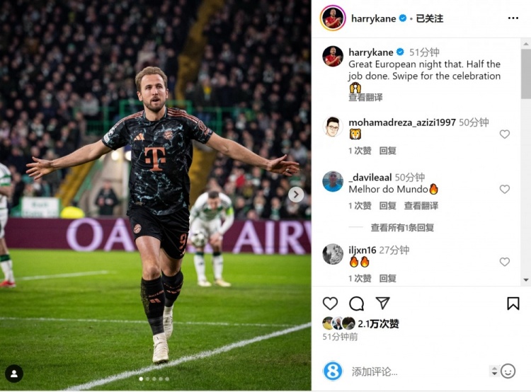 2月13日訊 歐冠淘汰賽附加賽首回合比賽,凱恩取得進(jìn)球,幫助拜仁客場2-1擊敗凱爾特人。凱恩賽后在社交媒體上曬出慶祝進(jìn)球的照片,配文:“美妙的歐冠之夜,任務(wù)完成了一半,滑動屏幕看我的慶祝?!?/p> 本文標(biāo)簽: 足球 德甲 拜仁慕尼黑 凱恩 歐冠
