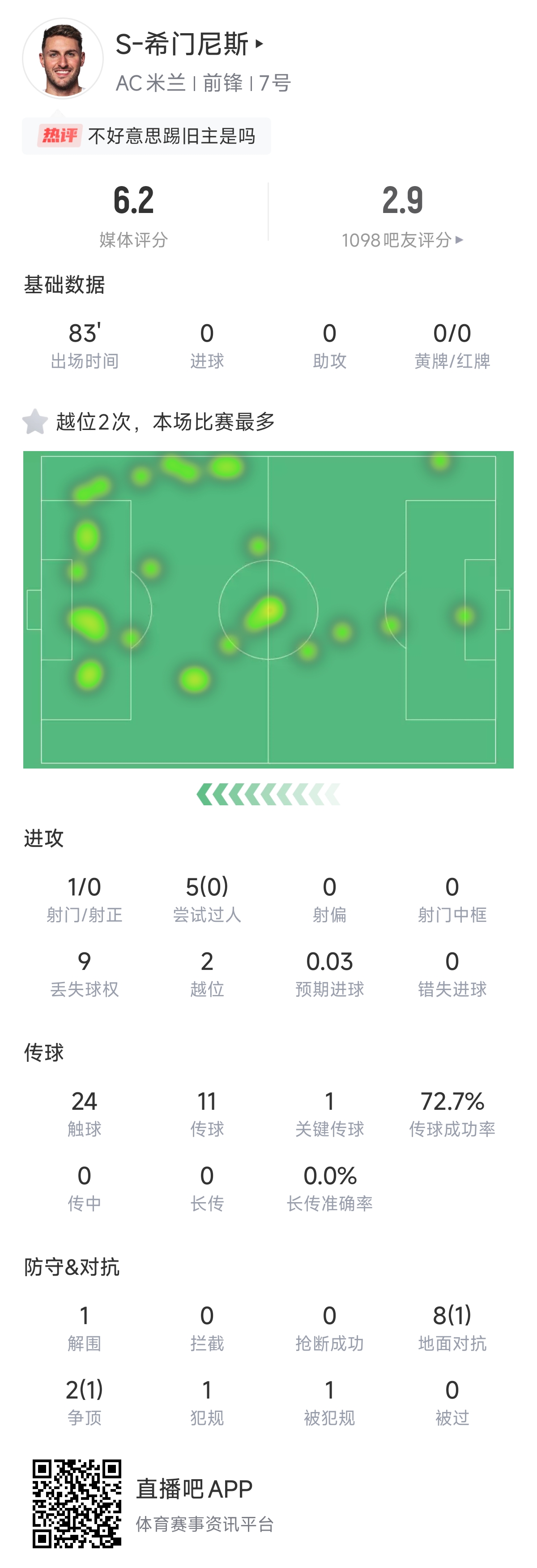 本場(chǎng)對(duì)陣舊主,希門尼斯出戰(zhàn)83分鐘僅有1腳射門,沒有射正。他5次過(guò)人0成功,8次對(duì)抗1成功,還有2次越位。在24次觸球的數(shù)據(jù)中,希門尼斯9次丟球權(quán),11次傳球72%成功率,包含一次關(guān)鍵傳球。