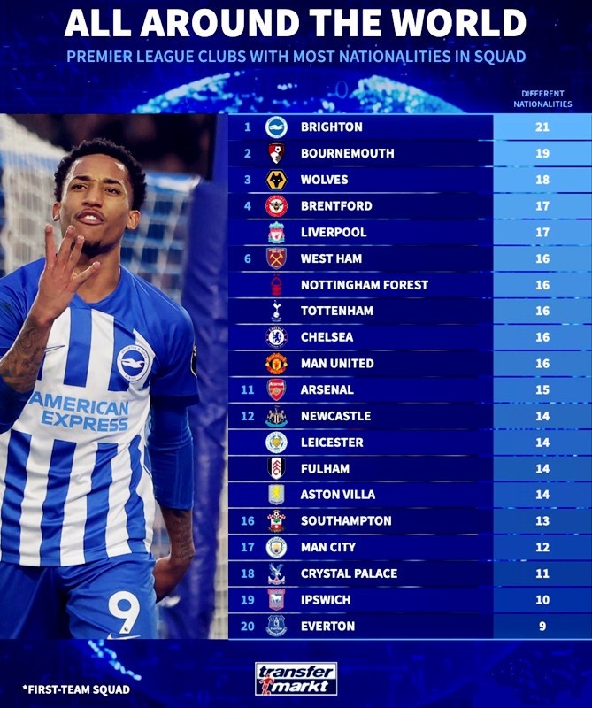 上賽季,布萊頓一線隊(duì)的球員來自21個(gè)國家。