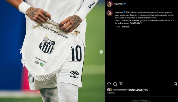 內(nèi)馬爾寫道:“比賽的結(jié)果并不理想,但我們知道自己的比賽方式.....我們正在改進(jìn)、增強(qiáng)實(shí)力,承擔(dān)風(fēng)險(xiǎn)并找到我們最好的狀態(tài)。我對(duì)這個(gè)球隊(duì)充滿信心,顯然最重要的是,我們是桑托斯足球俱樂(lè)部??!”