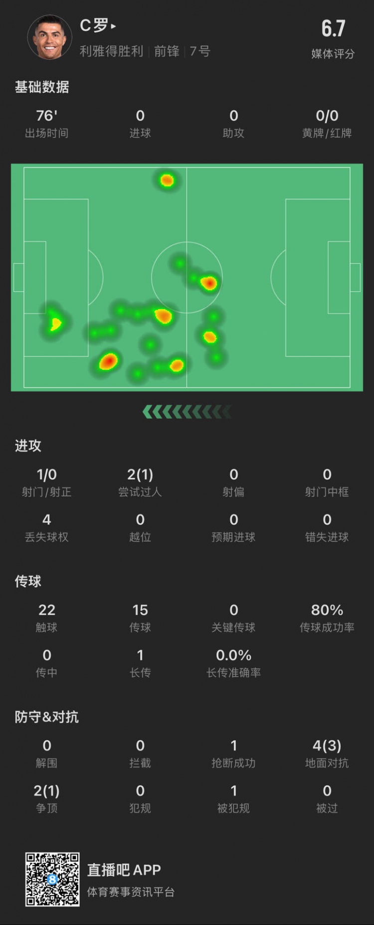 2月14日訊 沙特聯(lián)賽第20輪利雅得勝利對陣吉達(dá)國民的比賽正在進(jìn)行,C羅本場比賽首發(fā),第76分鐘被換下,以下是他本場比賽的數(shù)據(jù)。C羅本場數(shù)據(jù):出場時間76分鐘射門1次射正0次丟失球權(quán)4次22次觸球15次傳球傳球成功率80%地面對抗4次,3次成功爭頂2次,1次成功媒體評分6.7 本文標(biāo)簽: 足球 利雅得勝利 C羅