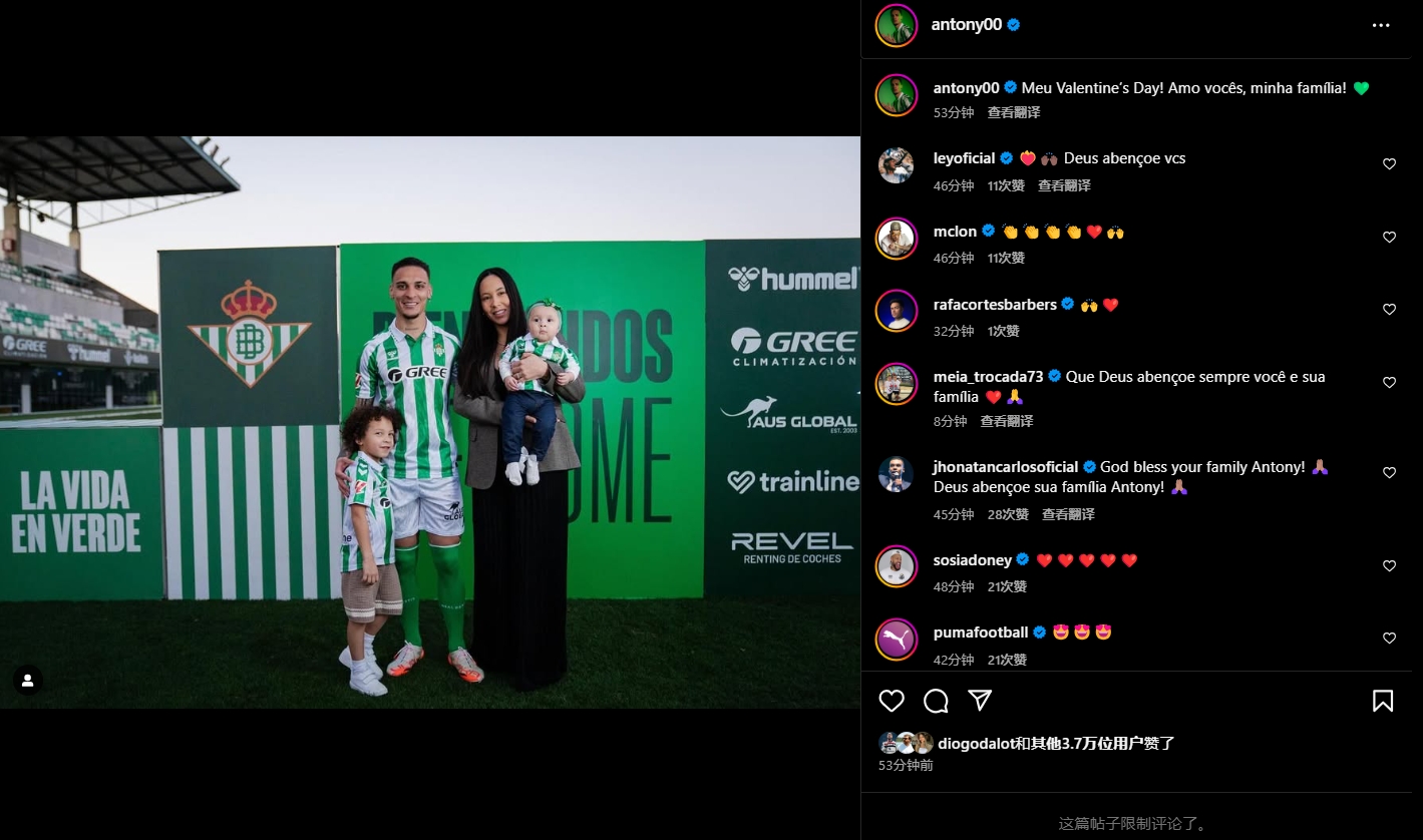 2月14日訊 今天是西方國(guó)家的情人節(jié)。貝蒂斯邊鋒安東尼在社媒曬出了自己與家人們的合照,配文道:屬于我的情人節(jié)!我愛(ài)你們我的家人! 本文標(biāo)簽: 足球 西甲 貝蒂斯