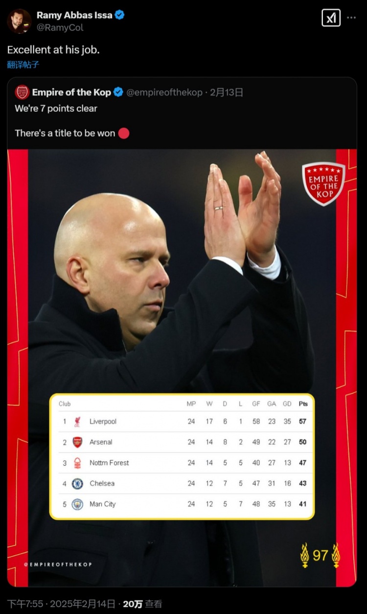 2月14日訊 薩拉赫經(jīng)紀(jì)人Ramy Abbas Issa更新社媒,轉(zhuǎn)發(fā)了英超積分榜。