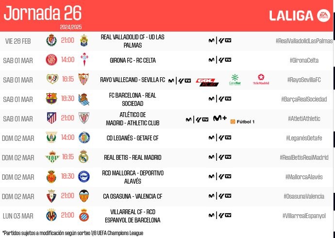 2月14日訊 西甲官方公布了第26輪比賽的開球時間,巴薩vs皇家社會3月2日1點30分開球,貝蒂斯vs皇馬3月2日23點15分開球。