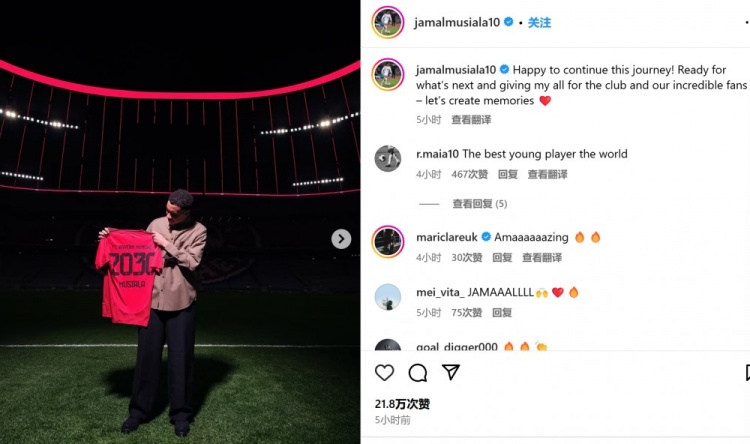 穆西亞拉曬出自己手持印有2030字樣的拜仁球衣照,并表示:“很高興能夠繼續(xù)這段旅程。已經(jīng)準(zhǔn)備好為我們的俱樂部以及令人難以置信的球迷們竭盡全力了!讓我們共同創(chuàng)造更多美好的記憶吧??”。