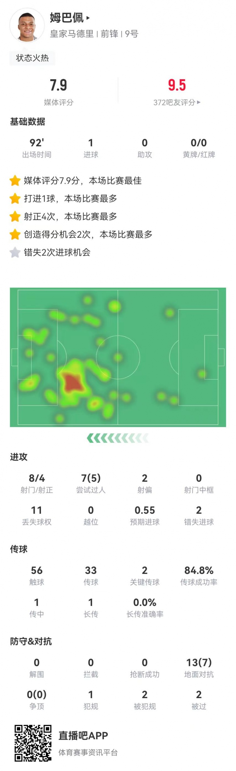 2月16日訊 皇馬在本輪西甲1-1戰(zhàn)平奧薩蘇納,姆巴佩本場數(shù)據(jù)如下: